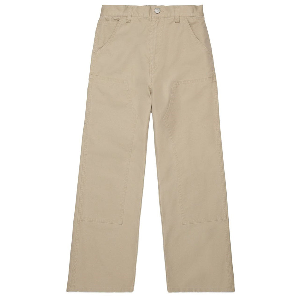 Pantaloni realizzati in cotone, caratterizzati da chiusura frontale con bottone e zip, vita elasticizzata sul retro, passanti per cintura, due tasche oblique sul davanti e due tasche applicate sul retro. Sono decorati con patch logo applicato sul taschino posteriore.