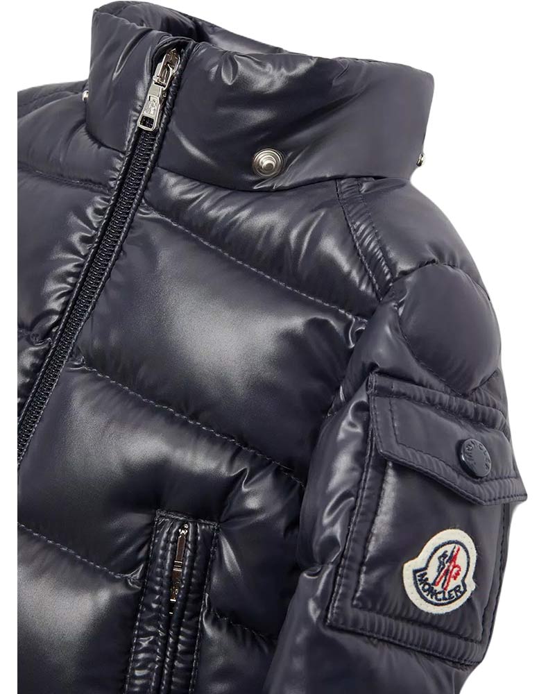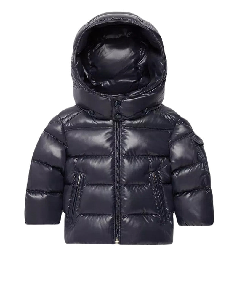 Moncler Maya Jacke aus lackiertem Nylon. Es verfügt über ein gestepptes Design, eine Gänsedaunenfüllung, eine abnehmbare Kapuze, einen Stehkragen, einen Reißverschluss vorne, eine Pattentasche mit Logo am Ärmel, seitliche Reißverschlusstaschen und elastische Bündchen.