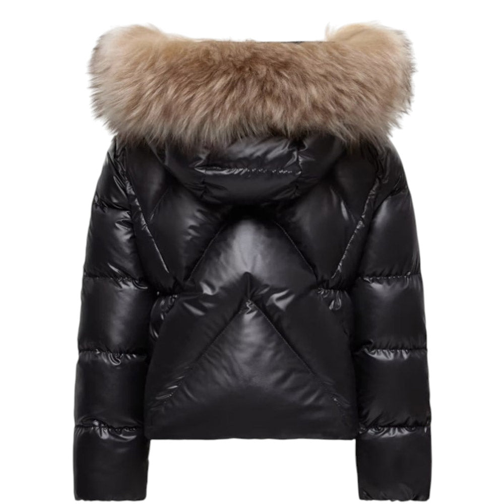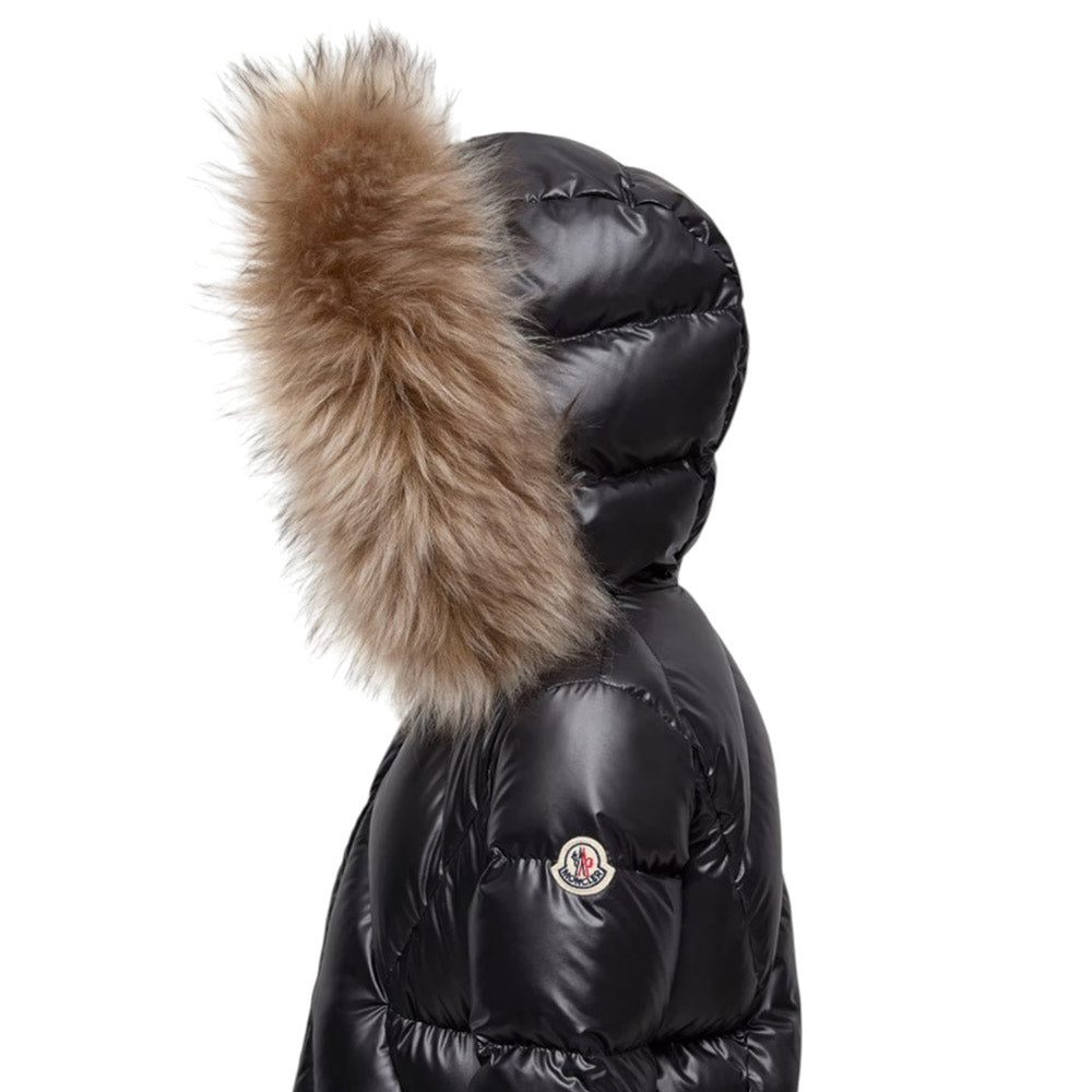 Giubbino imbottito Domas di Moncler, caratterizzato da design trapuntato, cappuccio fisso con bordo in vera pelliccia rimovibile, chiusura frontale con zip, maniche lunghe con polsi elasticizzati, due tasche laterali a filetto e orlo dritto. È decorato con patch logo applicata sulla manica.