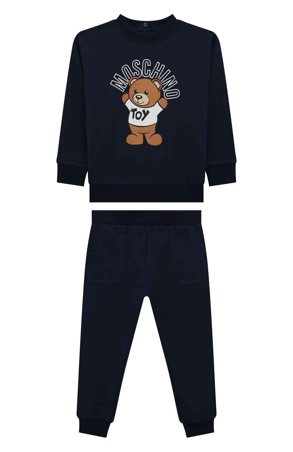Trainingsanzug bestehend aus einem Sweatshirt mit Rundhalsausschnitt, Aufdruck auf der Vorderseite und Clips auf der Rückseite sowie einer Hose mit aufgedrucktem Symbol auf der Rückseite.