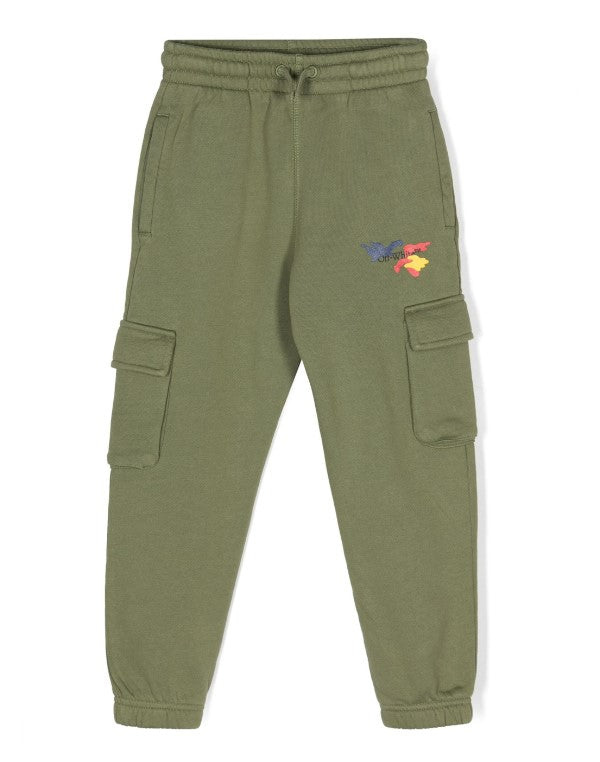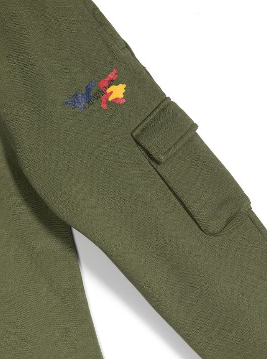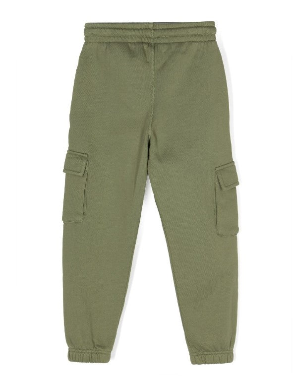 Cargo-Hose aus Baumwollfleece, elastische Taille und Kordelzug, elastische Knöchel, seitliche Leistentaschen, kontrastierender Logodruck auf der Vorderseite.