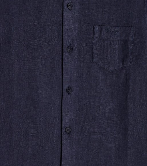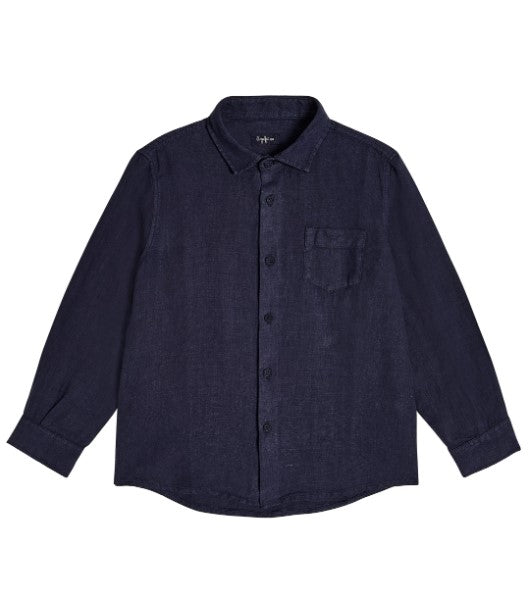 Langärmliges Babyhemd aus Leinen mit klassischem Kragen und aufgesticktem Logo auf der Vordertasche. Vorderer Verschluss mit Knöpfen.