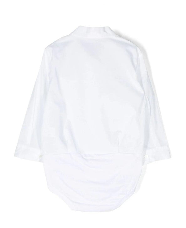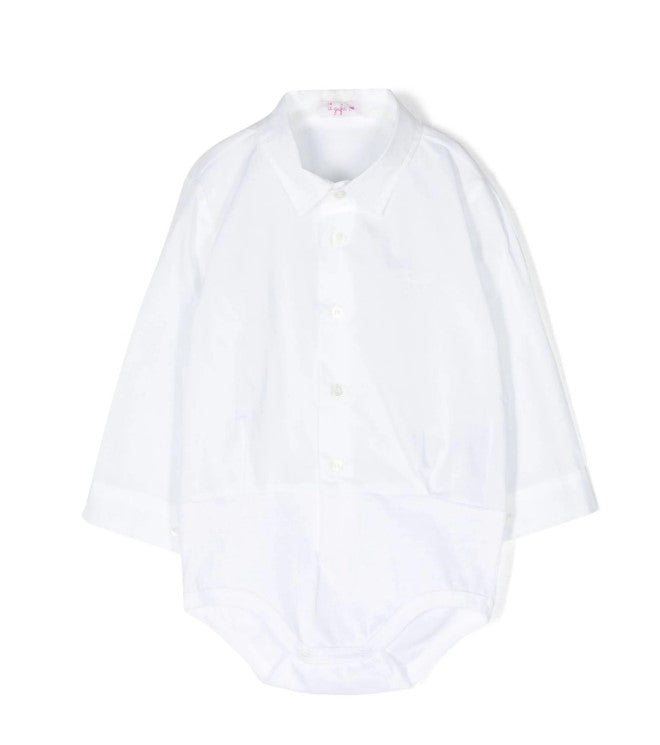 Baby-Bodyshirt mit klassischem Kragen, langen Ärmeln, Knopfverschluss vorne und Clipverschluss im Schritt.
