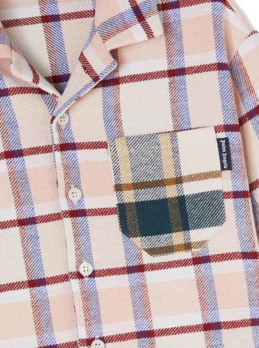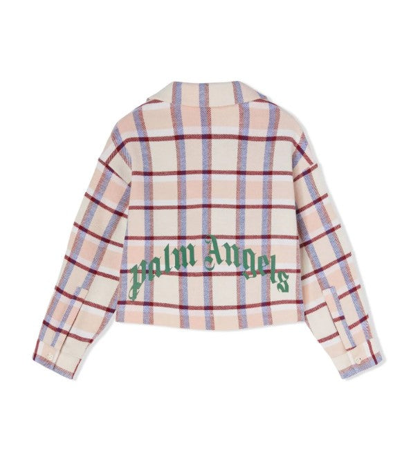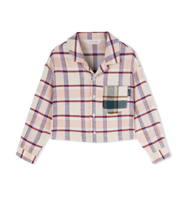 Langärmliges, verkürztes Mädchenhemd mit klassischem Kragen aus Flanell, durchgehendem Karomuster, Knopfverschluss vorne, aufgesetzter Brusttasche und kontrastierendem Logo-Druck auf der Rückseite.
