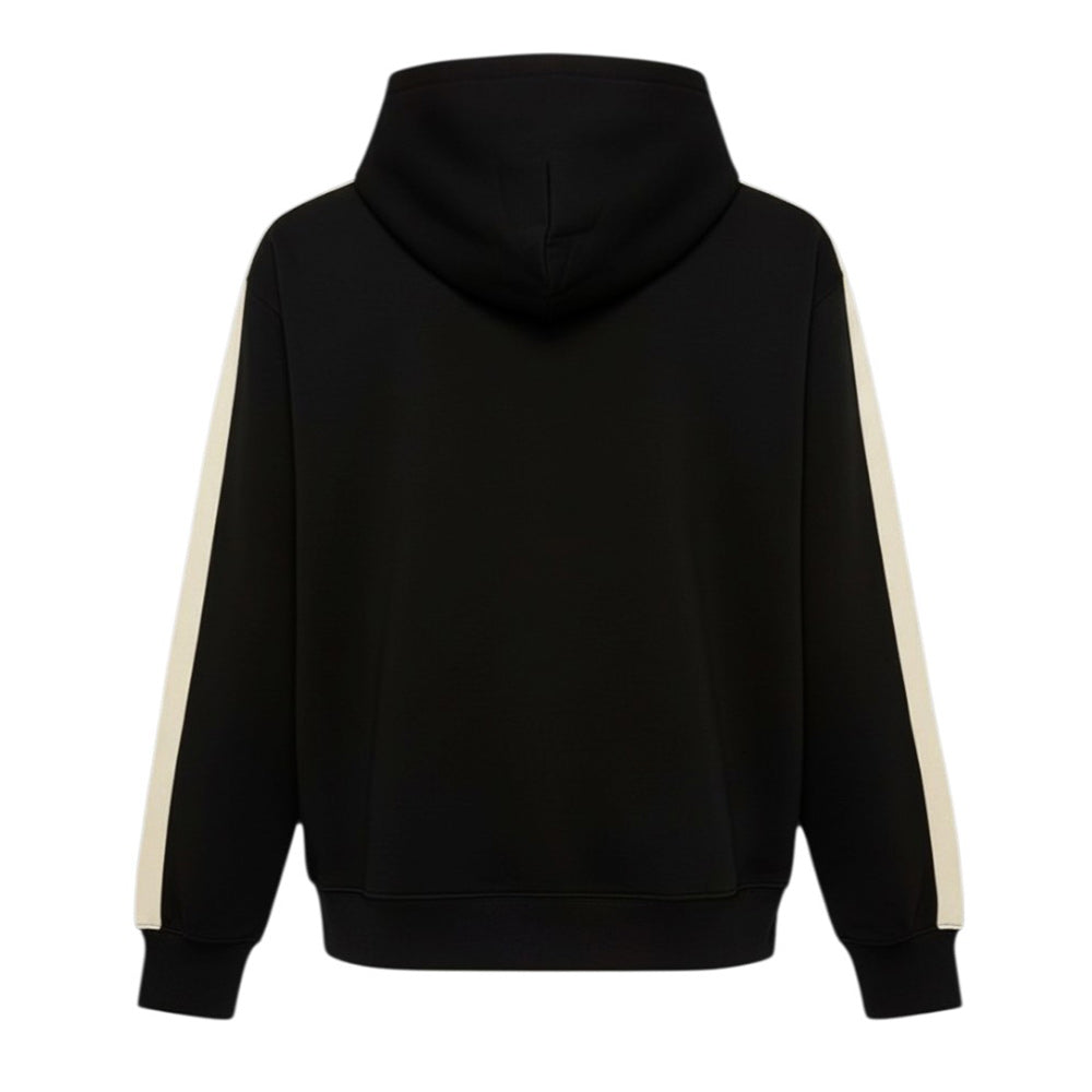 Felpa realizzata in jersey di misto viscosa. Il modello presenta ampio cappuccio, chiusura frontale con zip, maniche lunghe con bande écru a contrasto, polsi e orlo a costine. È decorata con logo stampato sul petto.