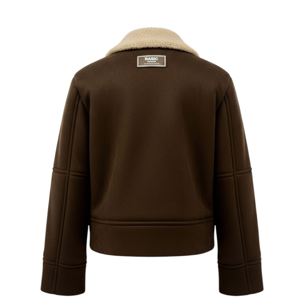 Montone con cuciture sovrapposte e dettagli in pelliccia ecologica. Presenta collo a punta, chiusura frontale con zip, maniche lunghe e due tasche a filetto sul davanti. È decorato con patch logo applicata sul retro.