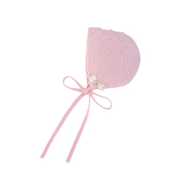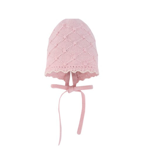 Gestrickte Mütze für Mädchen mit Rautenmuster und Bommeln. Verfügt über einen Kordelzug für zusätzlichen Komfort und Anpassung. Schleife mit Perlmuttplakette