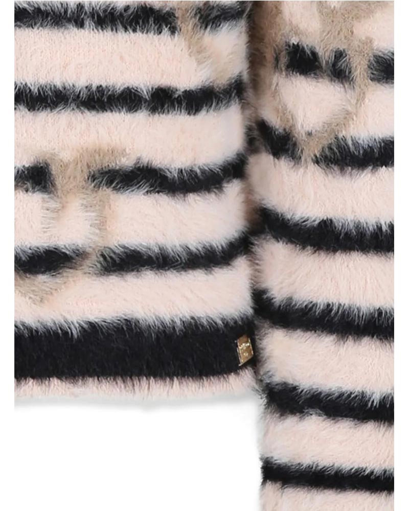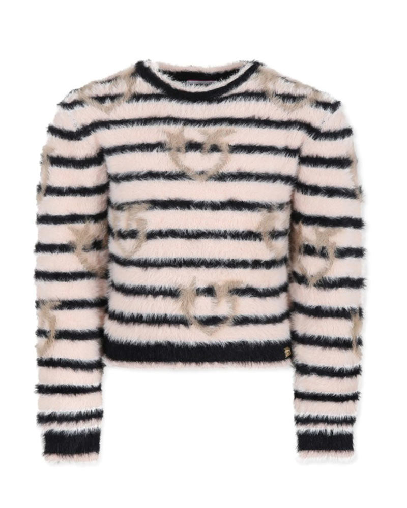Maglia da bambina realizzata in morbido tessuto effetto spazzolato. Presenta fantasia a righe, collo tondo, maniche lunghe e taglio cropped. È decorata con stampa Love Birds ad intarsio all-over e placca con logo applicata sul davanti.