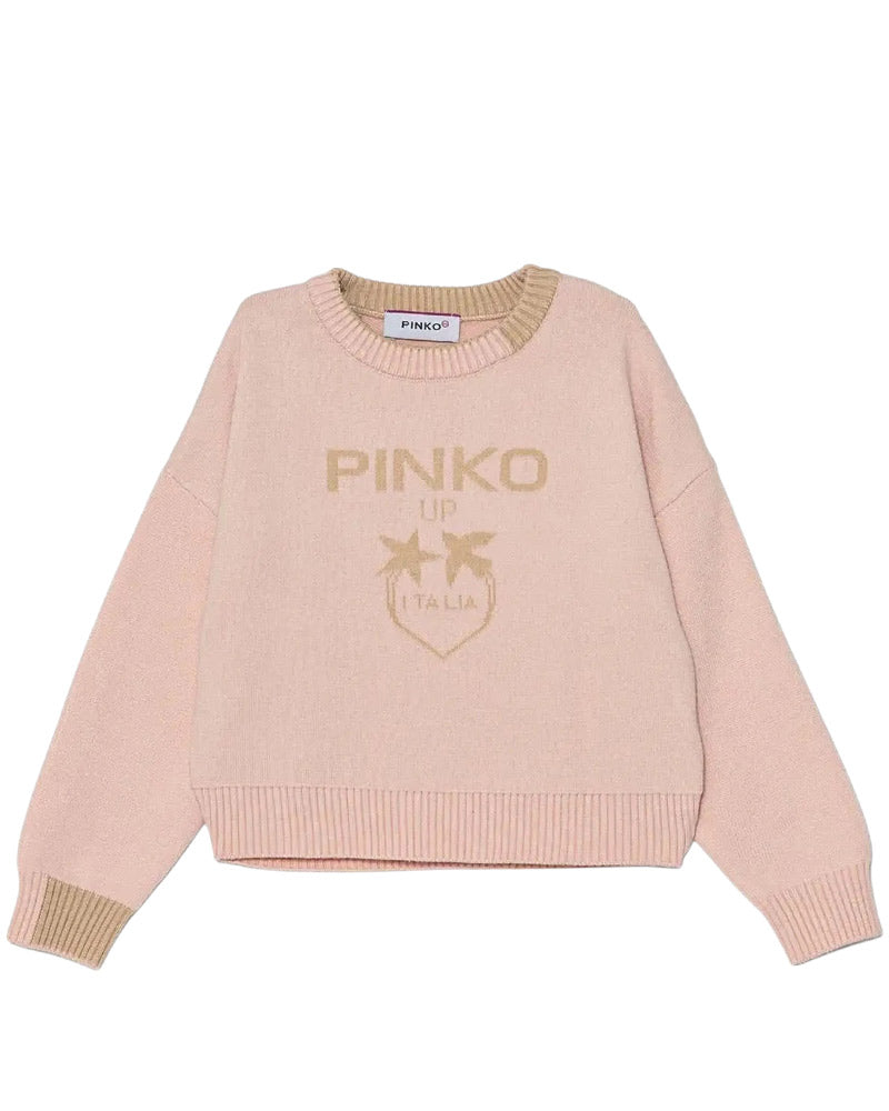 Maglia rosa da bambina caratterizzata da colletto tondo, spalle scese, maniche lunghe, logo ad intarsio sulla parte anteriore e finiture a coste.