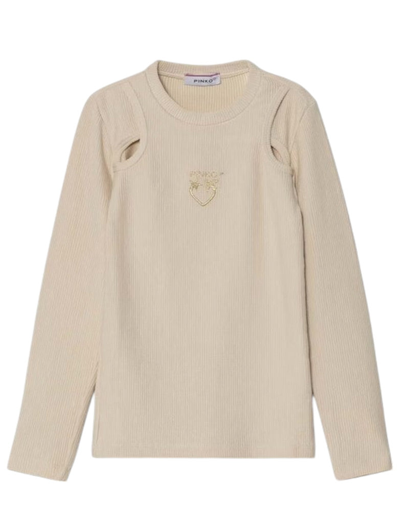 T-shirt a coste beige da bambina, caratterizzata da colletto tondo, maniche lunghe, dettagli cut out e logo ricamato sulla parte anteriore.