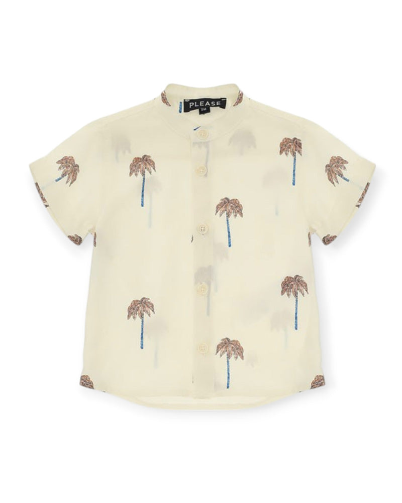 Camicia realizzata in fresco cotone, tessuto con fantasia con palme, maniche corte, abbottonatura frontale, taschino applicato.