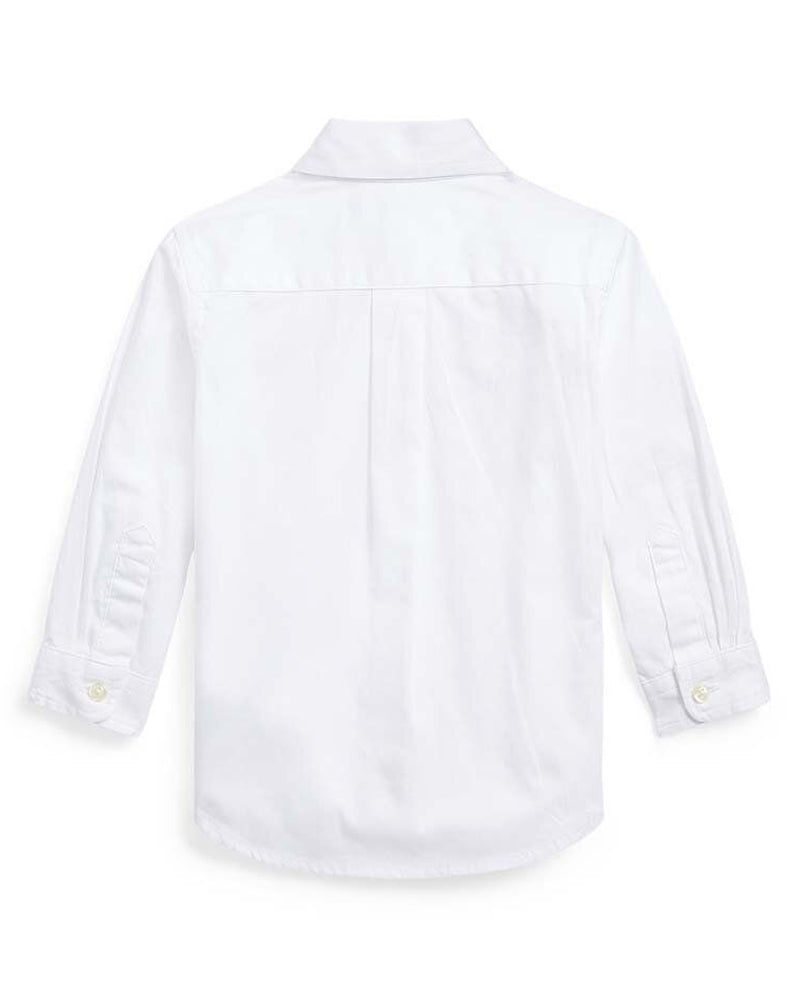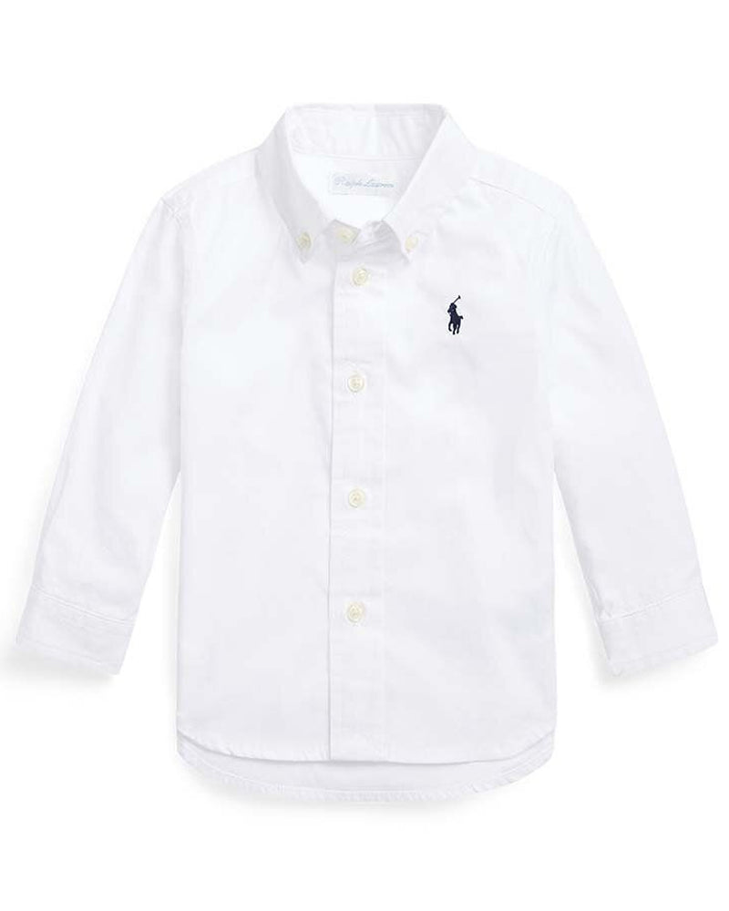 Camicia in cotone manica lunga con colletto botton down, abbottonatura frontale con bottoni, logo ricamato in contrasto.