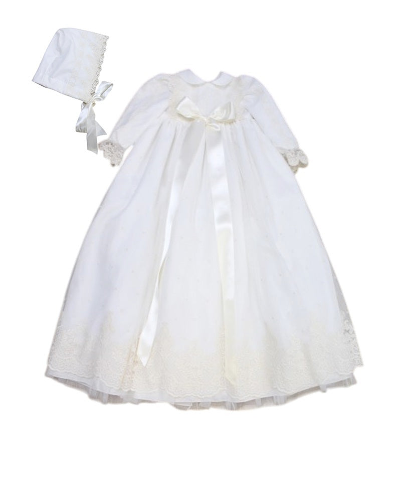veste battesimale lunga completa di cuffia apertura sul retro con bottoncini collo tondo fiocco sul davanti in raso tessuto in pizzo e tulle ricamato