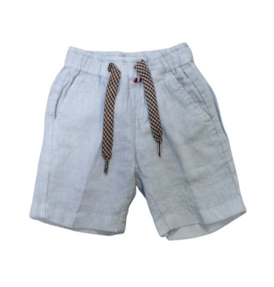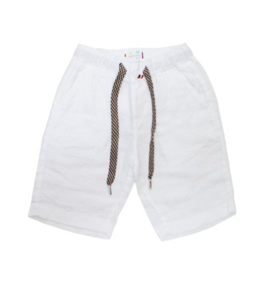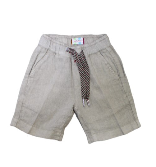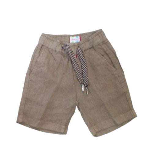 Kindershorts aus einfarbigem Leinen, elastischer und mehrfarbiger Kordelzug in der Taille, seitliche Amerika-Taschen, gerades Bein.