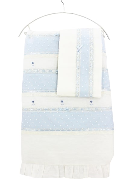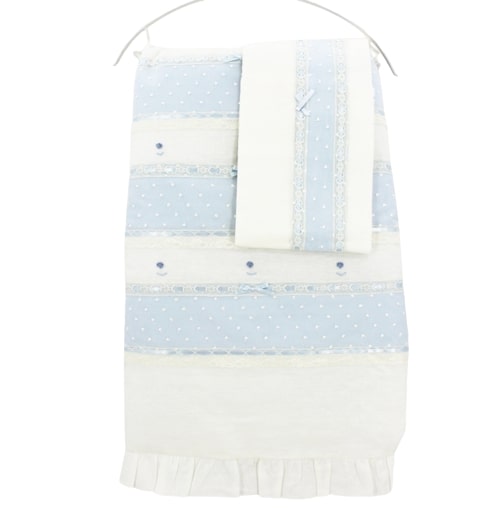 Passender Bezug mit herausnehmbarer Innendecke + schickes cremefarbenes Kinderbettlaken mit hellblauen Streifen, aufgestickten Dampfstichrosen und Organza.