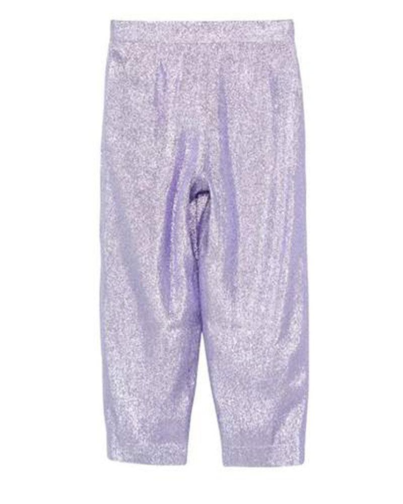 Pantaloni con finitura metallizzata da bambina. Presentano chiusura frontale con bottone e zip, pinces, vita regolabile grazie ad elastico interno con bottoni, tasche laterali.