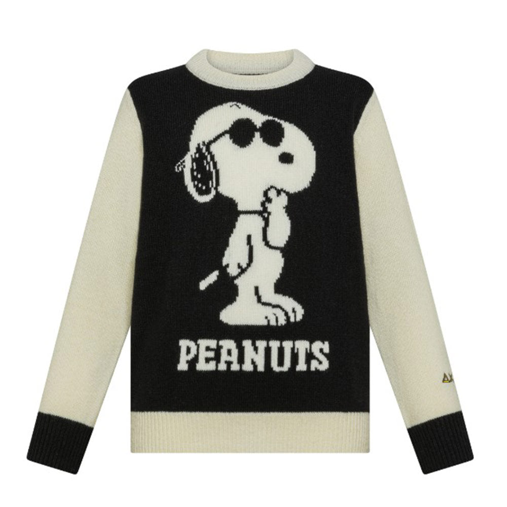 Maglia realizzata in misto lana, caratterizzata da collo tondo, maniche lunghe, orlo dritto e finiture a coste. È decorata con motivo Snoopy ad intarsio sul davanti e con logo ricamato sulla manica.