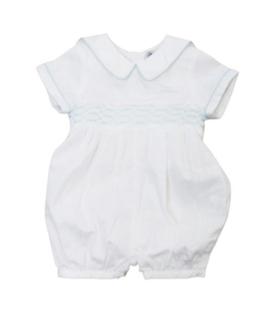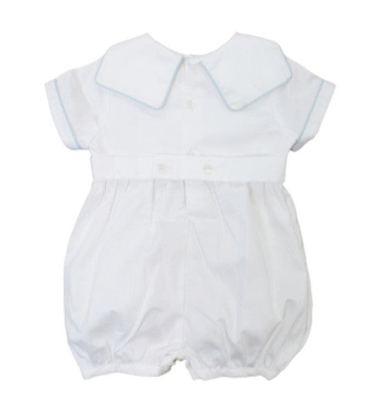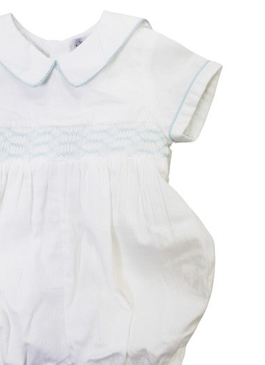 Strampler mit spitzem Kragen und kontrastierender, gesmokter Stickerei