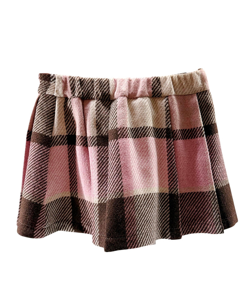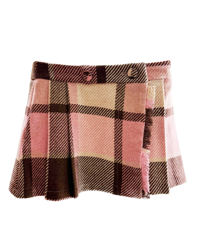 Gonna a portafoglio realizzata in misto lana da bambina. Presenta vita elasticizzata sul retro, chiusura frontale con due bottoni e fantasia tartan all-over.