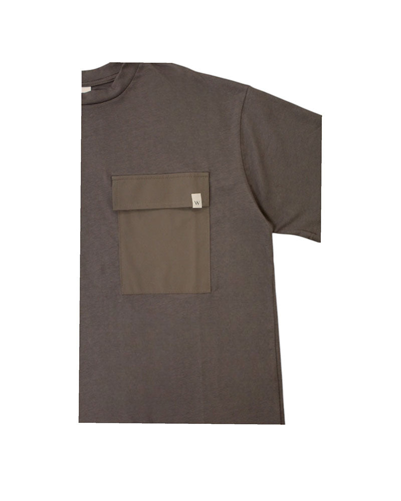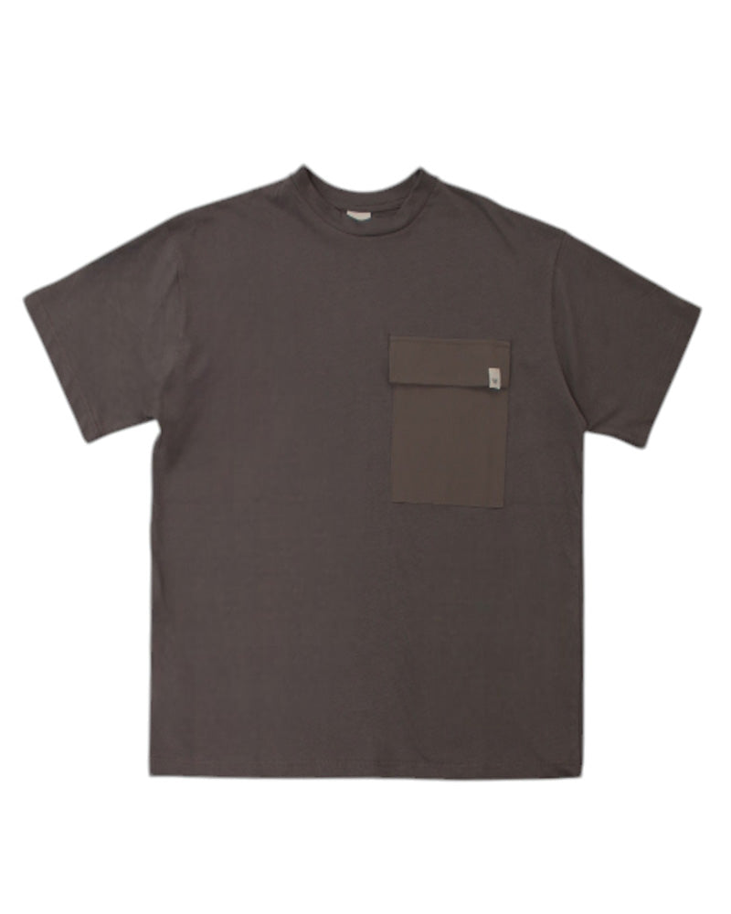 T-shirt girocollo, manica corta, orlo ditto, taschina applicata sul petto con pattina.