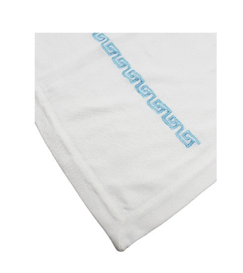 Versace Neugeborenendecke aus weißem Garn mit hellblauen Details. Modell mit eingenähtem Markenschriftzug aus hellblauer Baumwolle in der Mitte und dekorativem Band.