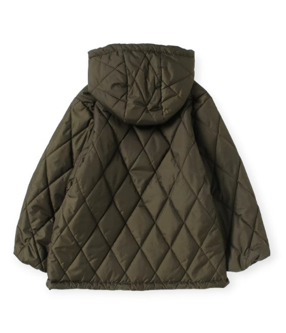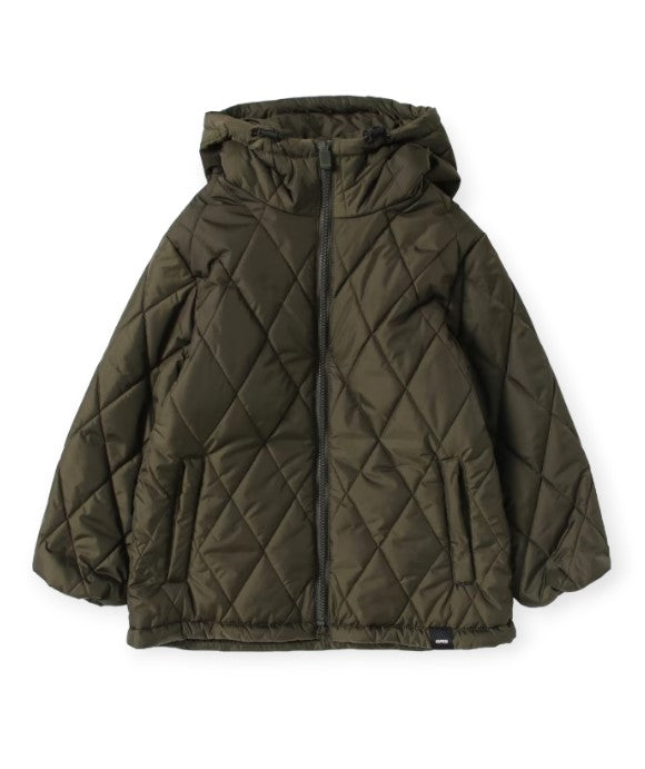 Girls' quilted nylon jacket with fixed hood, front zip fastening, side slant pockets with zip, elasticated cuffs, straight hem with drawstring.