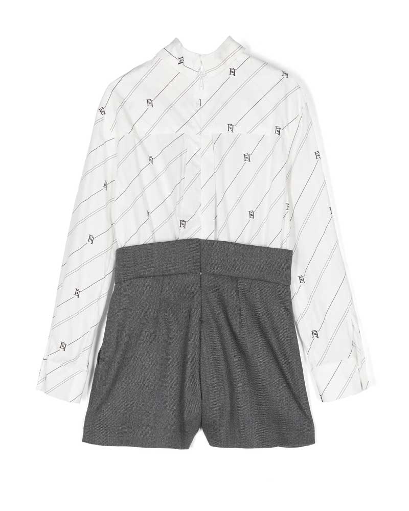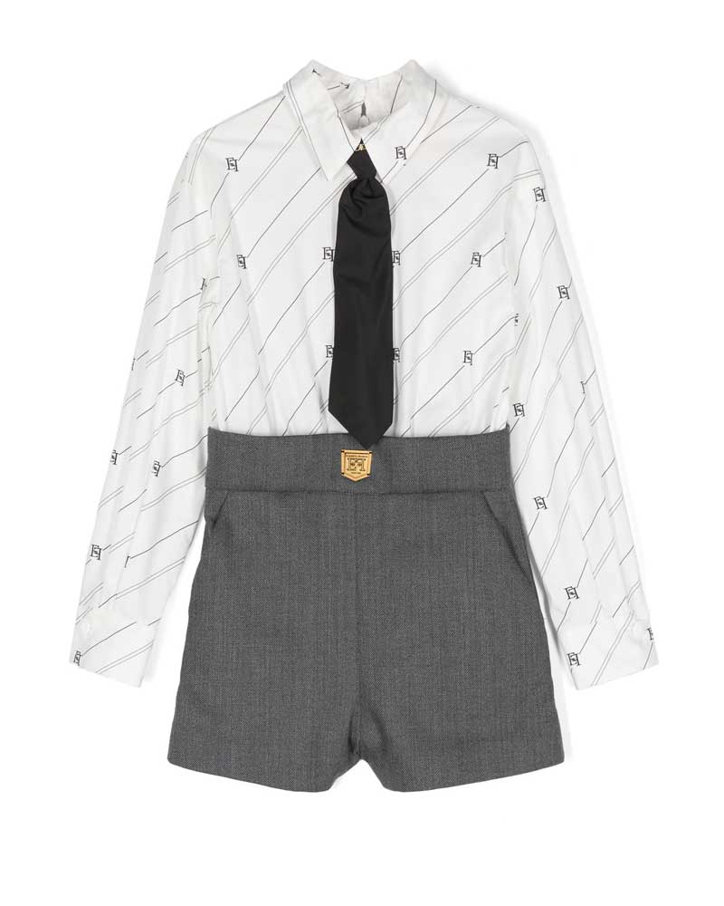 This Elisabetta Franchi short jumpsuit, with American pockets, logo patterned shirt and logo tie, is an elegant and versatile garment. The shirt with classic collar and front button closure pairs perfectly with the wool blend shorts with gold logo applique. In addition, the invisible zip closure on the back guarantees a comfortable and perfect fit for any occasion.
