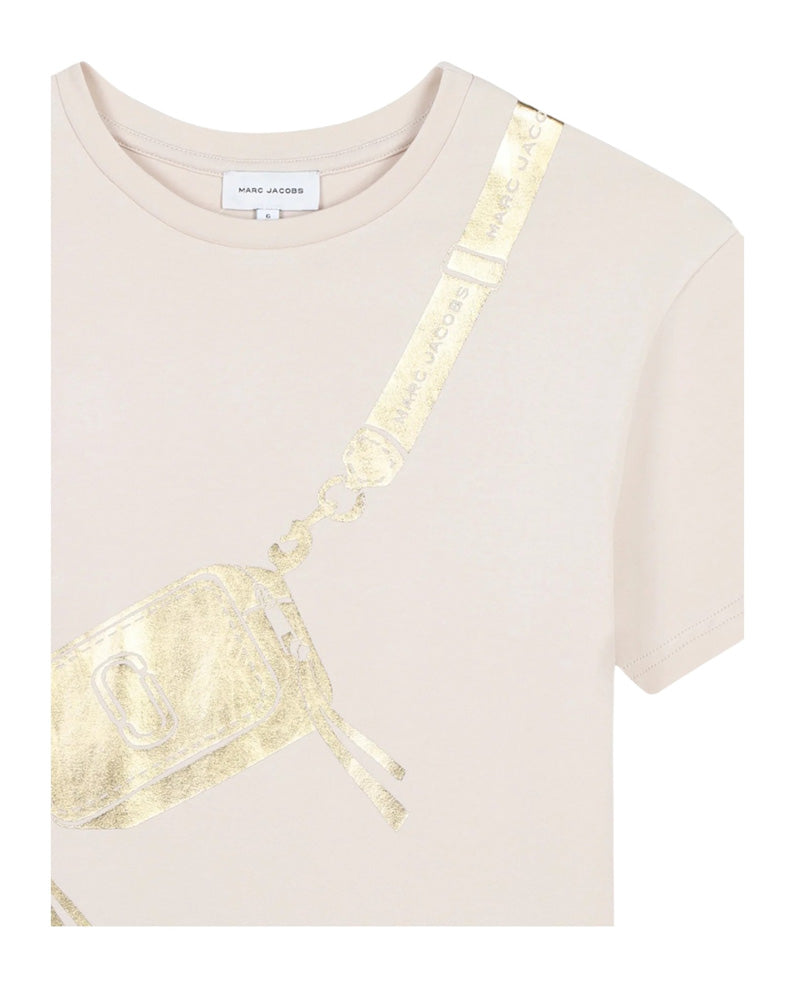 Abito girocollo a maniche corte realizzato in jersey di cotone da bambina. È decorato con stampa borsa trompe - l'oeil sul davanti.