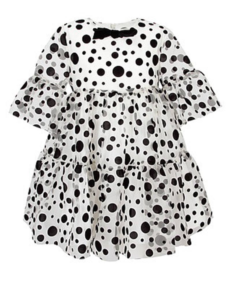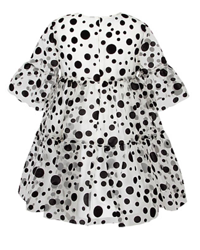Abito elegante a posi da bambina, caratterizzato da collo tondo, maniche a 3/4, chiusura sul retro con zip e gonna a balze. È decorato con fiocchetto nero in ciniglia sul davanti.