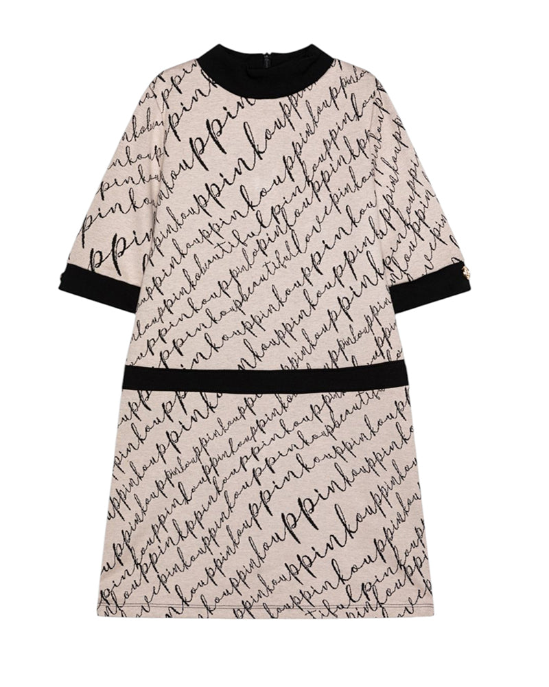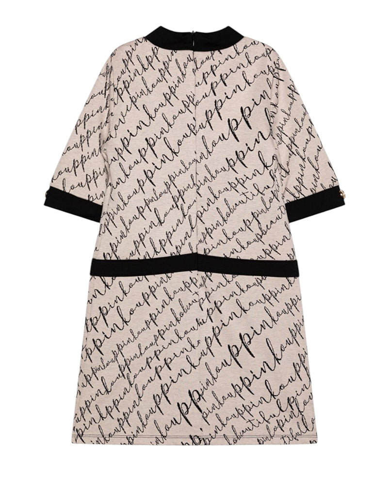 Abito beige da bambina, realizzato in maglia di misto viscosa. Presenta collo tondo, maniche a 3/4 e chiusura sul retro con zip. È decorato con fantasia logo jacquard all-over.