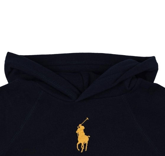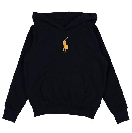 Hoodie, kangaroo pocket, embroidered logo on the front.