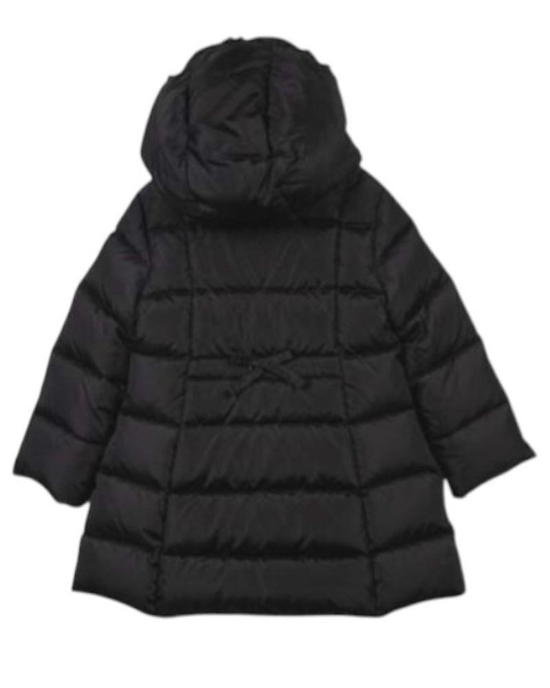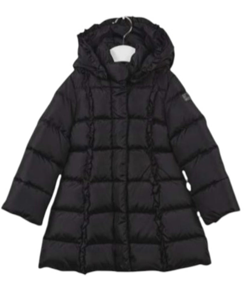 Long quilted jacket for girls, welt pockets, zip fastening, removable hood, applied ruffles.