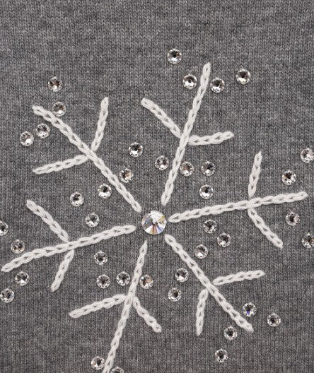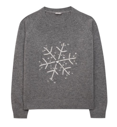 Crew neck sweater with contrasting embroidery and applications on the front.