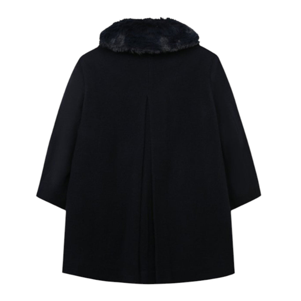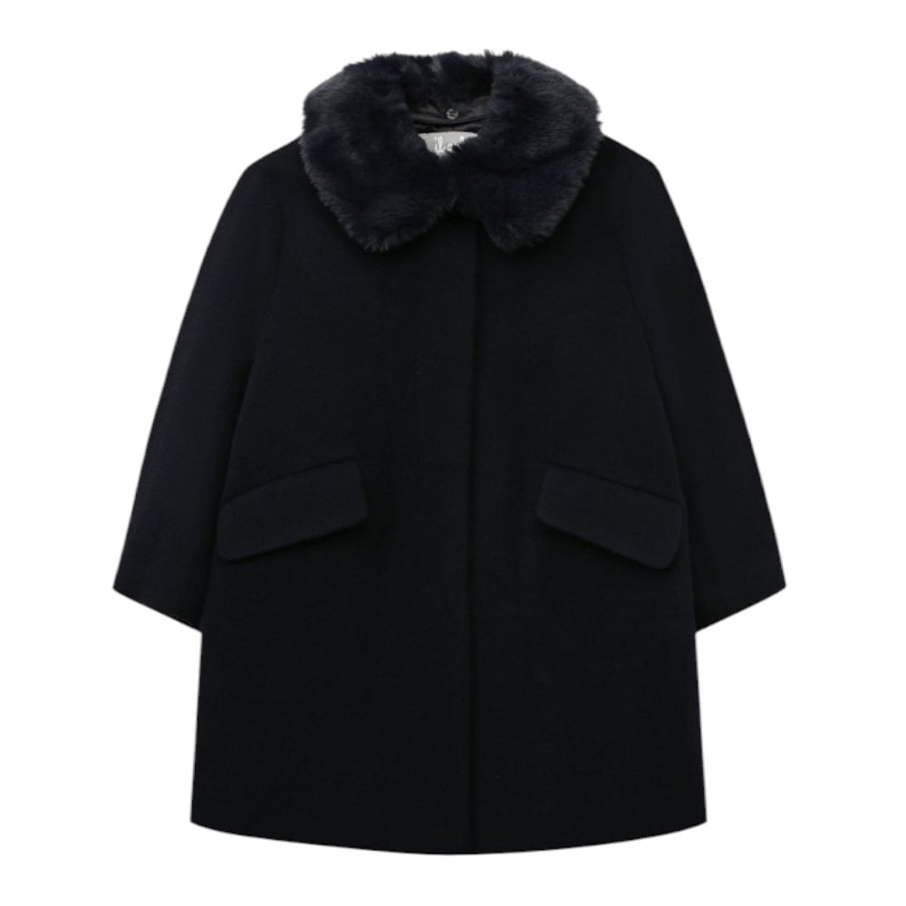 Wool coat, round faux fur collar, flap pockets, button fastening.