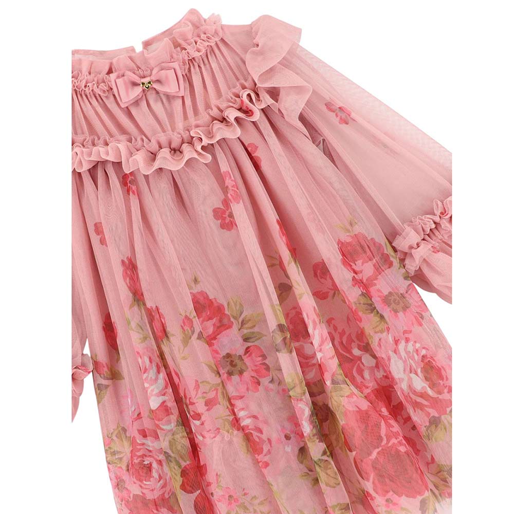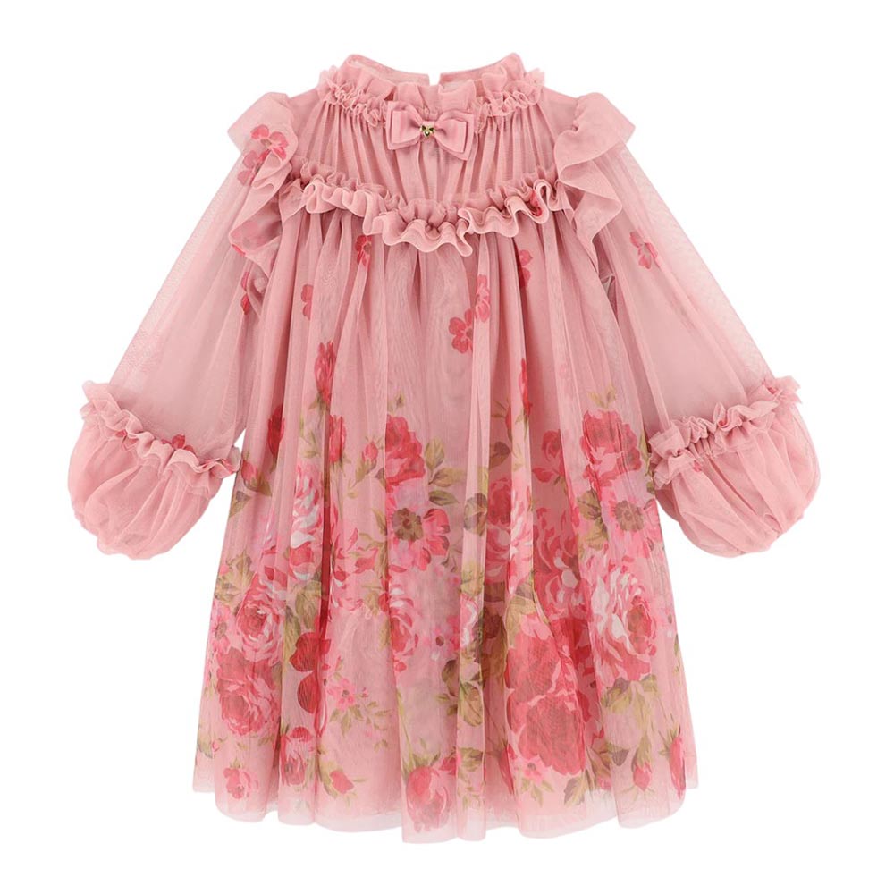 Questo voluminoso abito in tulle rosa è perfetto per feste o occasioni speciali. Le maniche lunghe a sbuffo con polsini elasticizzati, i volant lungo il carré e la scollatura e le morbide arricciature creano una silhouette elegante. Completamente foderato in morbido misto cotone elasticizzato. L'abito è completato dal fiocco e dalla borchia a cuore dorata sulla scollatura, e si chiude sul retro con un bottone dorato.