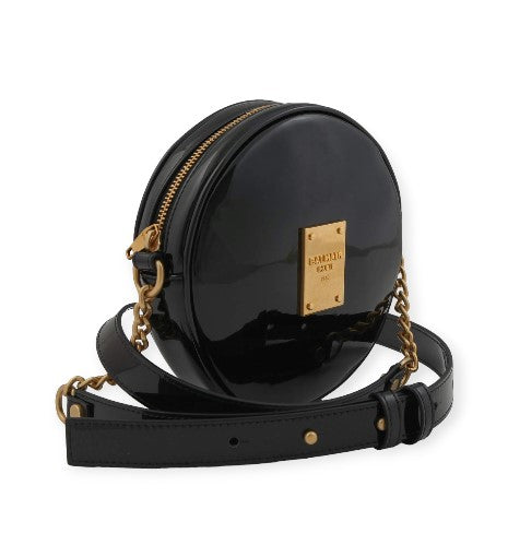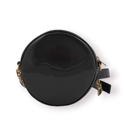 Girl's bag, round model in patent leather by Balmain, zip closure and gold-colored logo detail. Equipped with an adjustable black shoulder strap with gold chain ends.