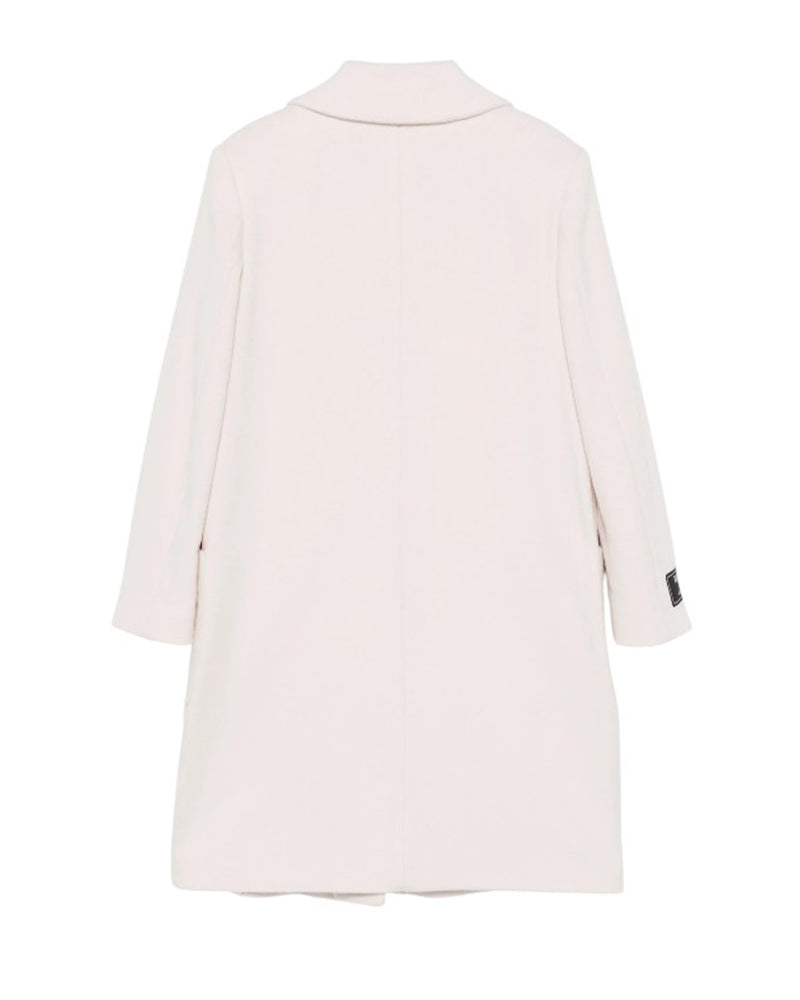Cappotto monopetto avorio da bambina realizzato in misto lana cashmere. Presenta collo a revers, chiusura frontale con bottoni argento, maniche lunghe e due tasche applicate sul davanti. È decorato con frange sulla parte anteriore e patch logo applicata sulla manica.