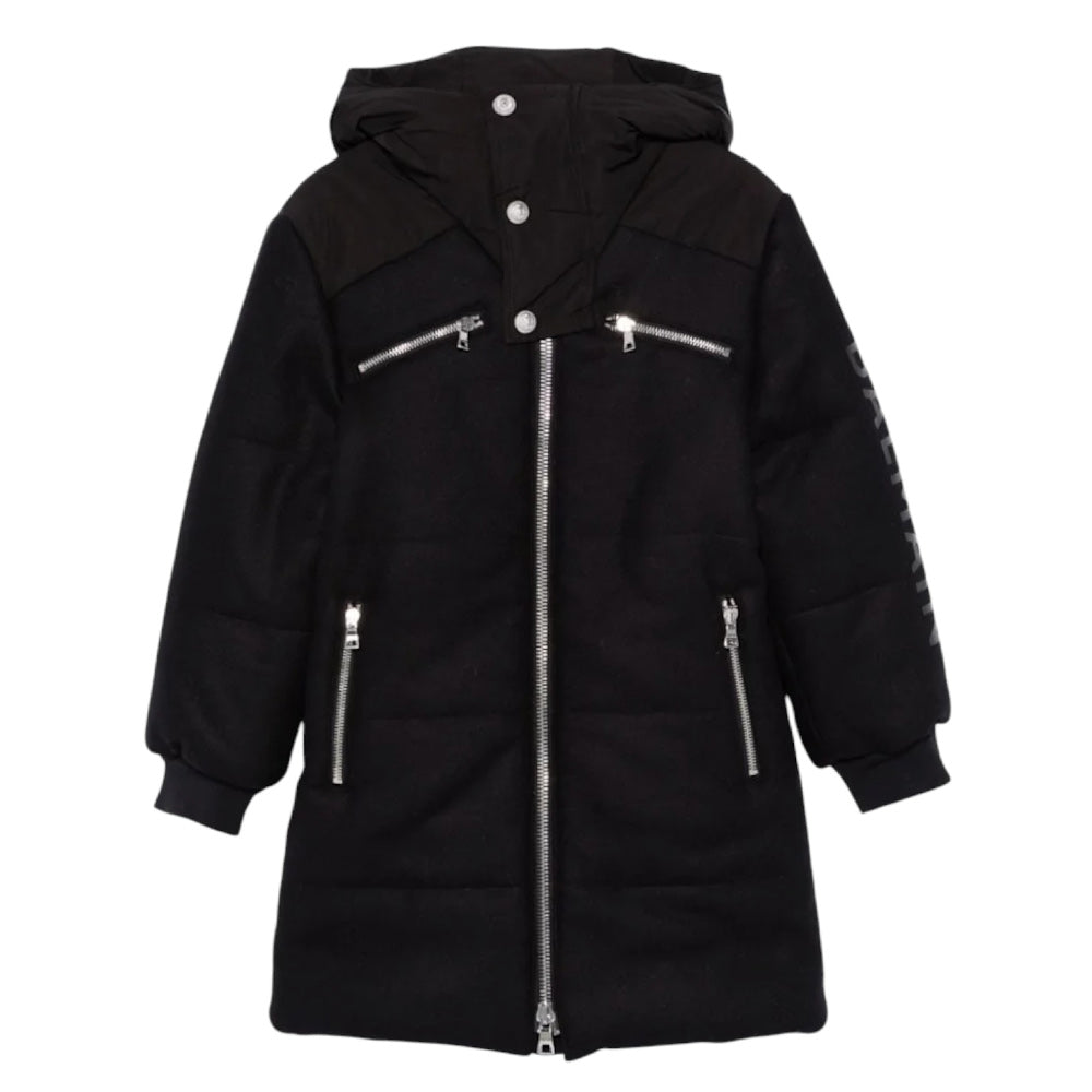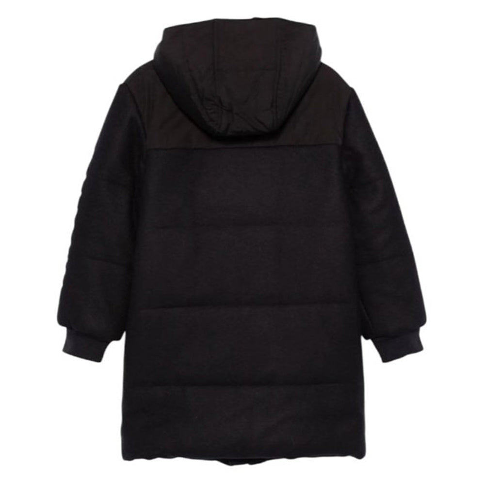 Giubbino bi-tessuto nero da bambina, realizzato in misto lana e nylon. Presenta design inbottitto, cappuccio fisso, maniche lunghe con polsi a coste, chiusura frontale con zip, quattro tasche frontali a filetto con zip e orlo dritto. È decorato con stampa logo sulla manica.