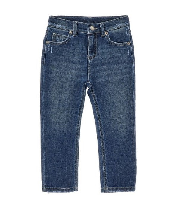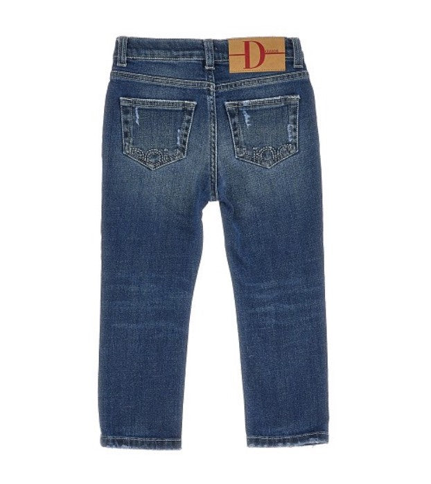 Cotton denim jeans, five-pocket model. Front closure with button and zip.