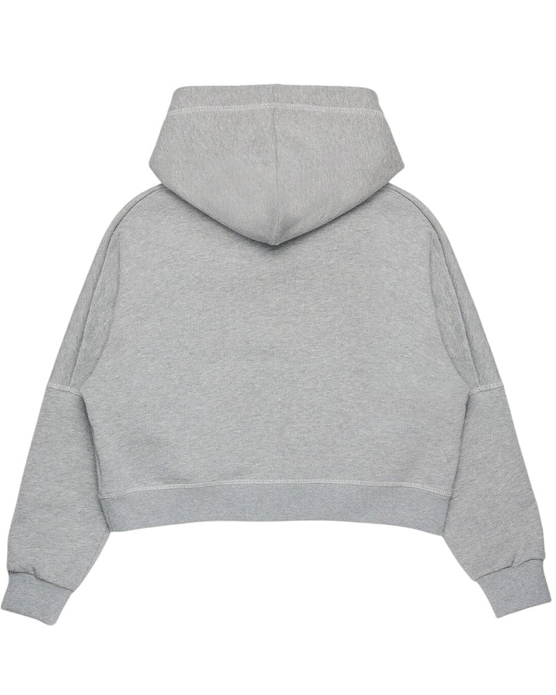 Felpa grigia con cappuccio da bambina, realizzata in cotone. Presenta maniche lunghe con le spalle scese, stampa logo sulla parte anteriore, tasca a marsupio, taglio cropped, polsi e orlo a coste.