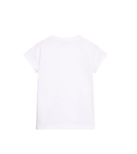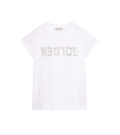 Girls' crew neck, short sleeve cotton T-shirt with rhinestone logo application on the front.