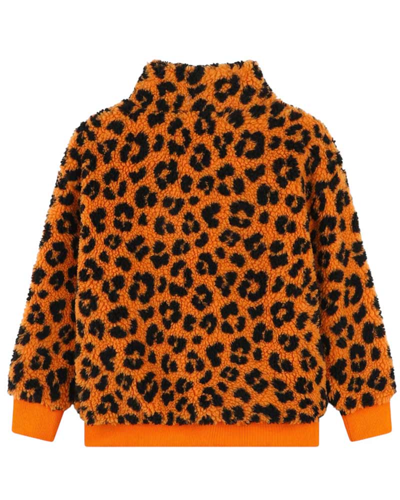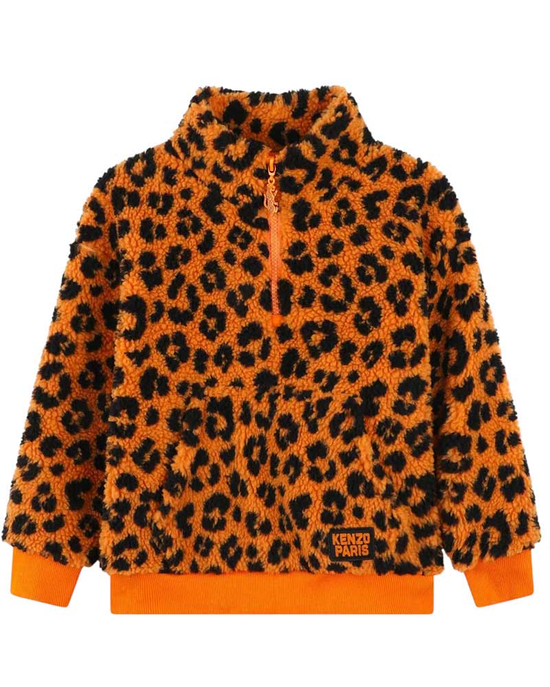 Felpa arancione da bambina realizzata in tessuto teddy. Presenta fantasia animalier al-over, chiusura frontale con zip, tasca a marsupio sul davanti, polsi e orlo a coste. È decorata con patch logo applicata sulla parte anteriore.