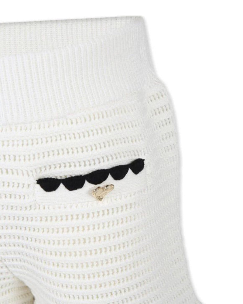 Shorts da bambina con lavorazione all'uncinetto. Presentano vita elasticizzata, due tasche frontali a filetto, orlo smerlato e bordi a contrasto. Sono decorati con applicazione ciondoli a forma di cuore sul davanti.