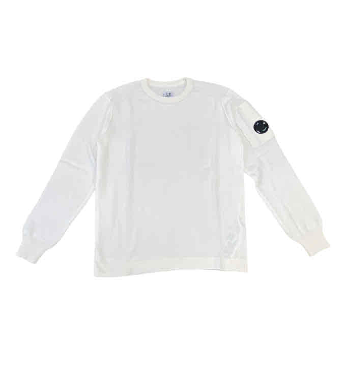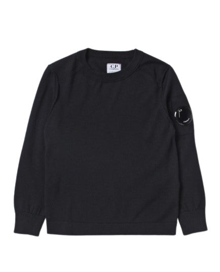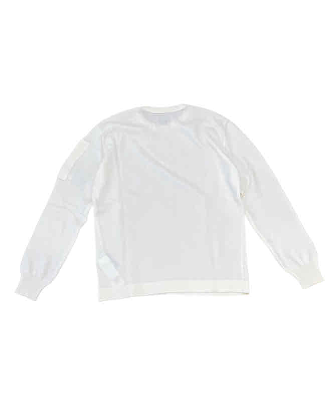 Crew neck wool sweater, patch pocket with logo on the sleeve.