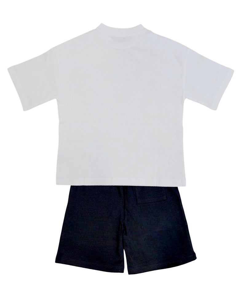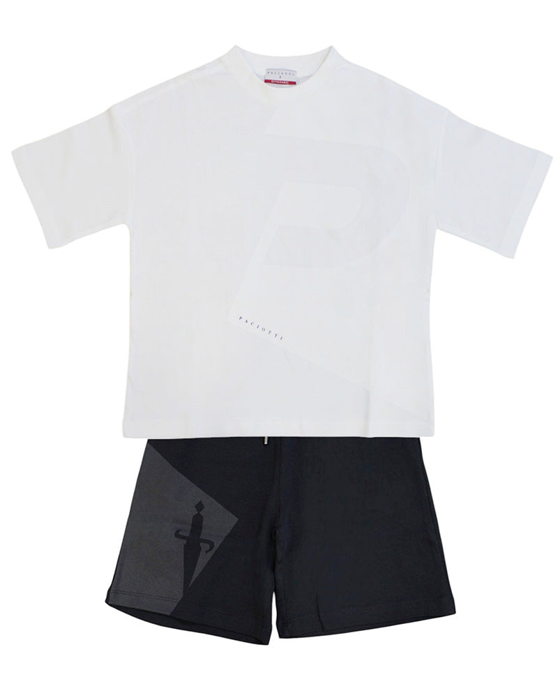 Completo composto da bermuda con elastico e coulisse in vita, tasche a filetto, logo stampato in tono e t-shirt girocollo manica corta con logo in tono.