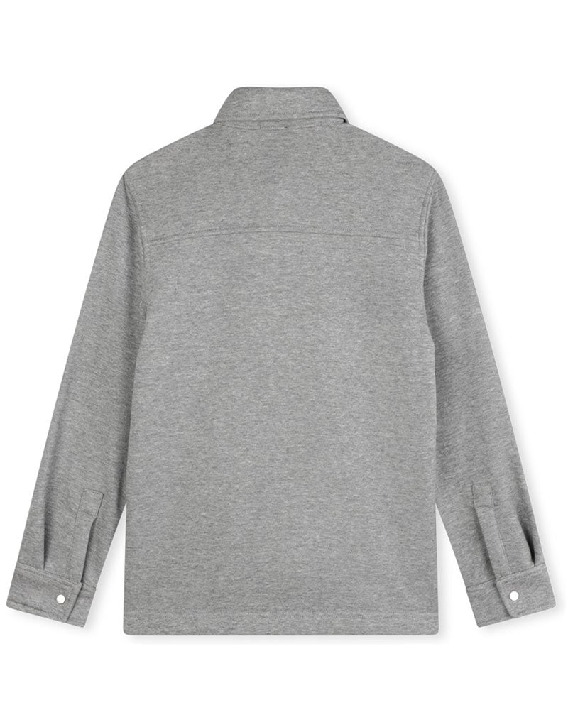 Camicia realizzata in felpa di cotone da bambino. Presenta colletto a punta, chiusura frontale con bottoni a pressione, maniche lunghe, fodera in pile, due tasche con patta applicate sul petto e due tasche a filo laterali. È decorata con placca logo in metallo applicata sul davanti.
