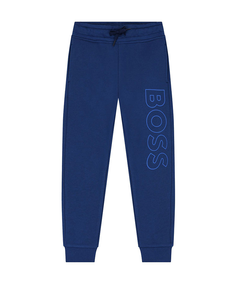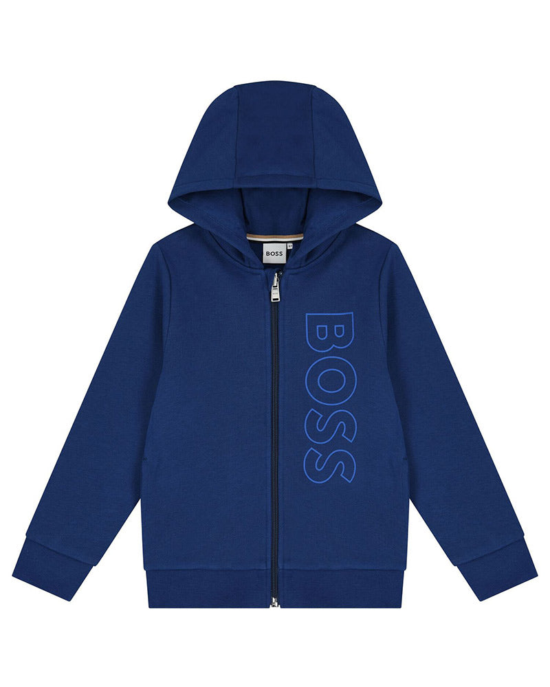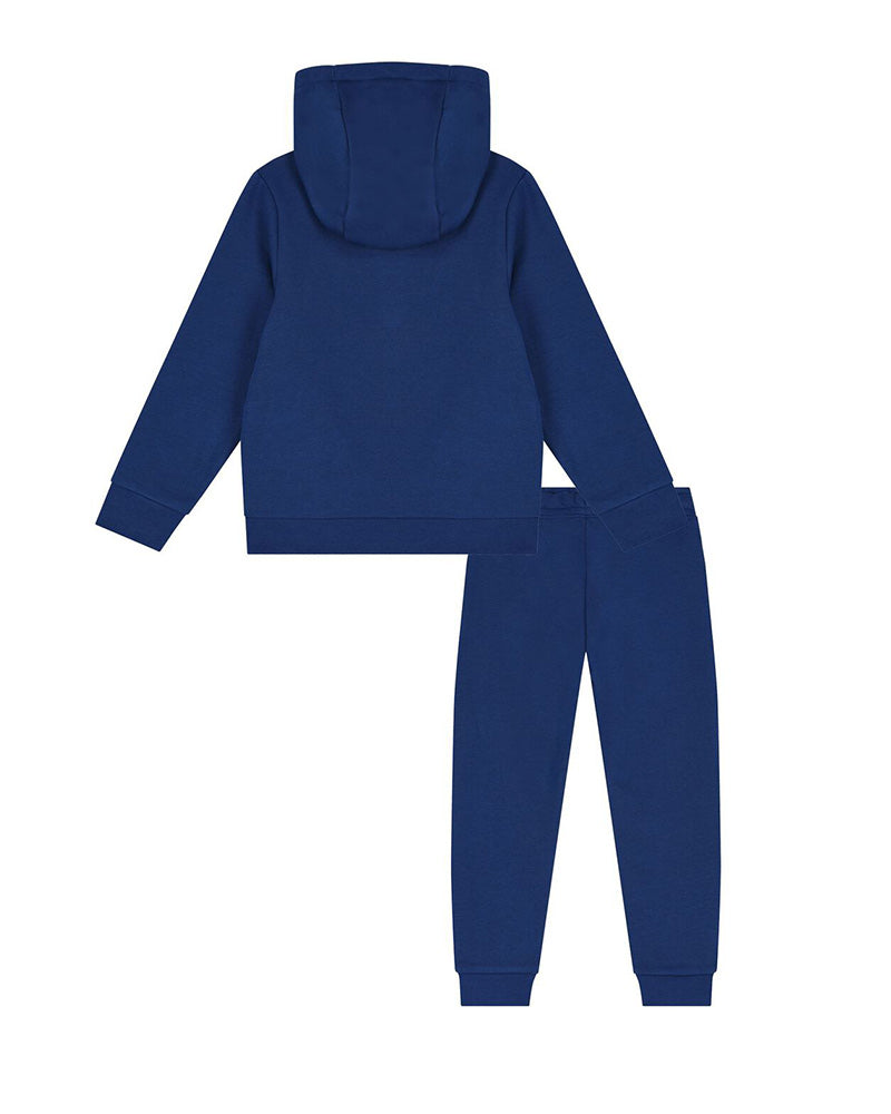 Completo realizzato in felpa di cotone garzato da bambino. Presenta felpa con zip e cappuccio a maniche lunghe, stampa logo sulla parte anteriore, tasche a filo laterali e finiture a coste; Pantaloni jogger con vita elasticizzata e coulisse, tasche a filo laterali, logo stampato sulla gamba e fondo con elastico alla caviglia.