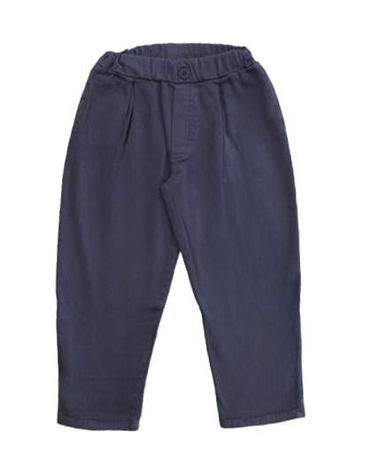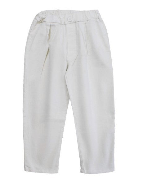 Cotton trousers with pleats on the front, elasticated waist with decorative button at the waist.
