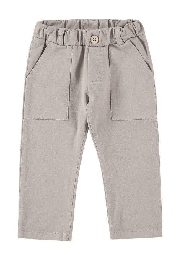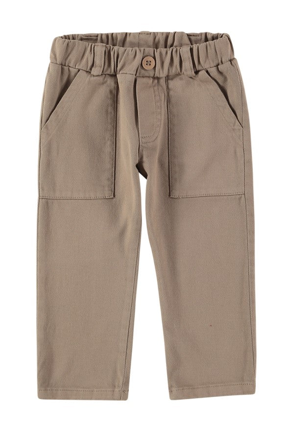 Straight leg trousers in cotton, elasticated waist with decorative button, two patch pockets on the front.