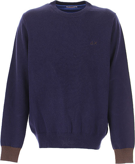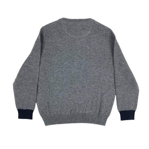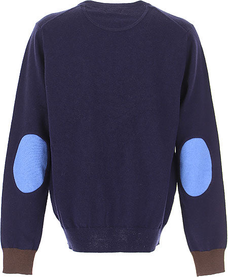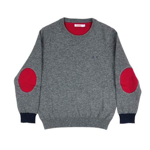 Crew neck wool sweater, contrasting patches on the sleeves, contrasting cuffs, embroidered logo on the chest.